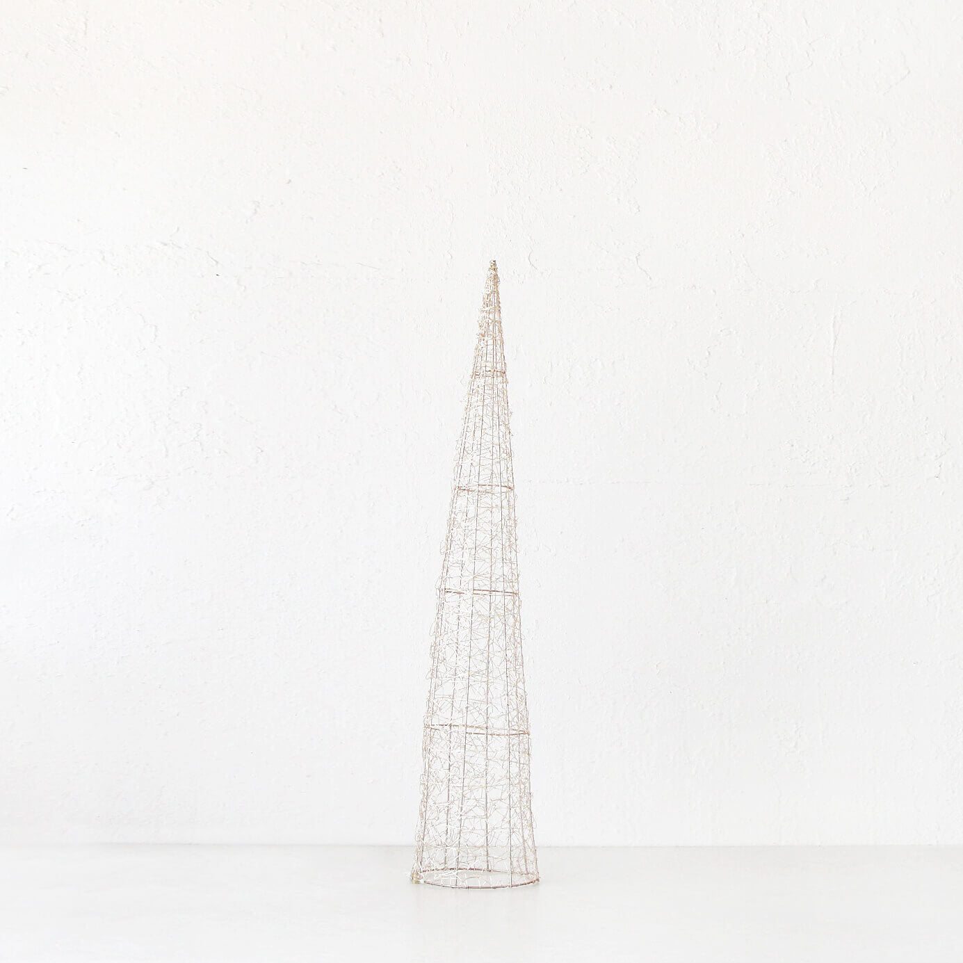 Add a modern, glowing touch to your holiday season décor with the Centauri Illuminous LED Cone Christmas Tree bundle x3. This elegant plug-in LED bundle features three gold-coloured metal-framed trees in three different sizes, adorned with warm, energy-efficient LED lights that illuminate beautifully. Perfect for indoor displays, the minimalist design and vibrant lighting of these Christmas trees make them a striking centrepiece for any festive setting. Available in three different heights, each with a plug in cord, they can stand alone as focal points or be arranged together to create a stunning, layered display.