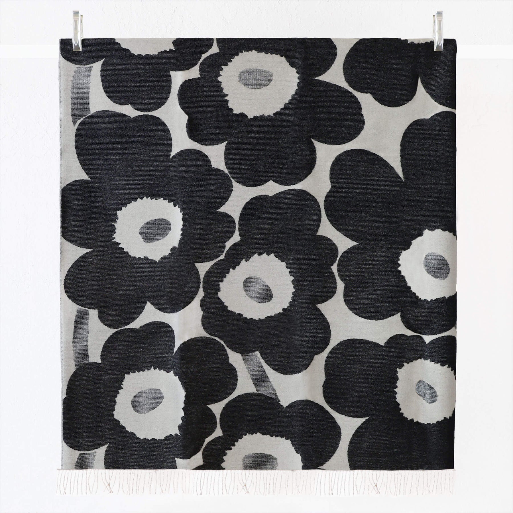 The Marimekko Unikko Blanket in black and white is a beautiful wool and cotton blend blanket with fringes at the ends.