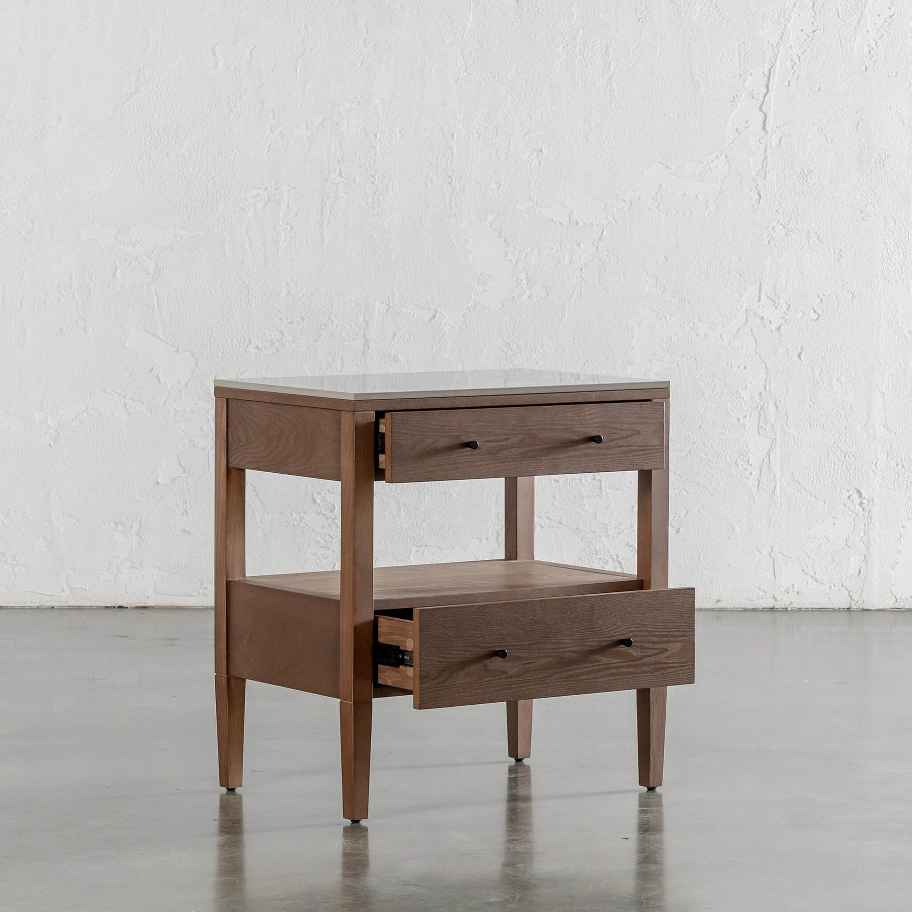 TREVELO PERNEL CONRAD NIGHT STAND  |  DEEP WALNUT  |  VALENTINA GRIGIO CERAMICA TOP | DRAWERS OPEN CLOSEUP