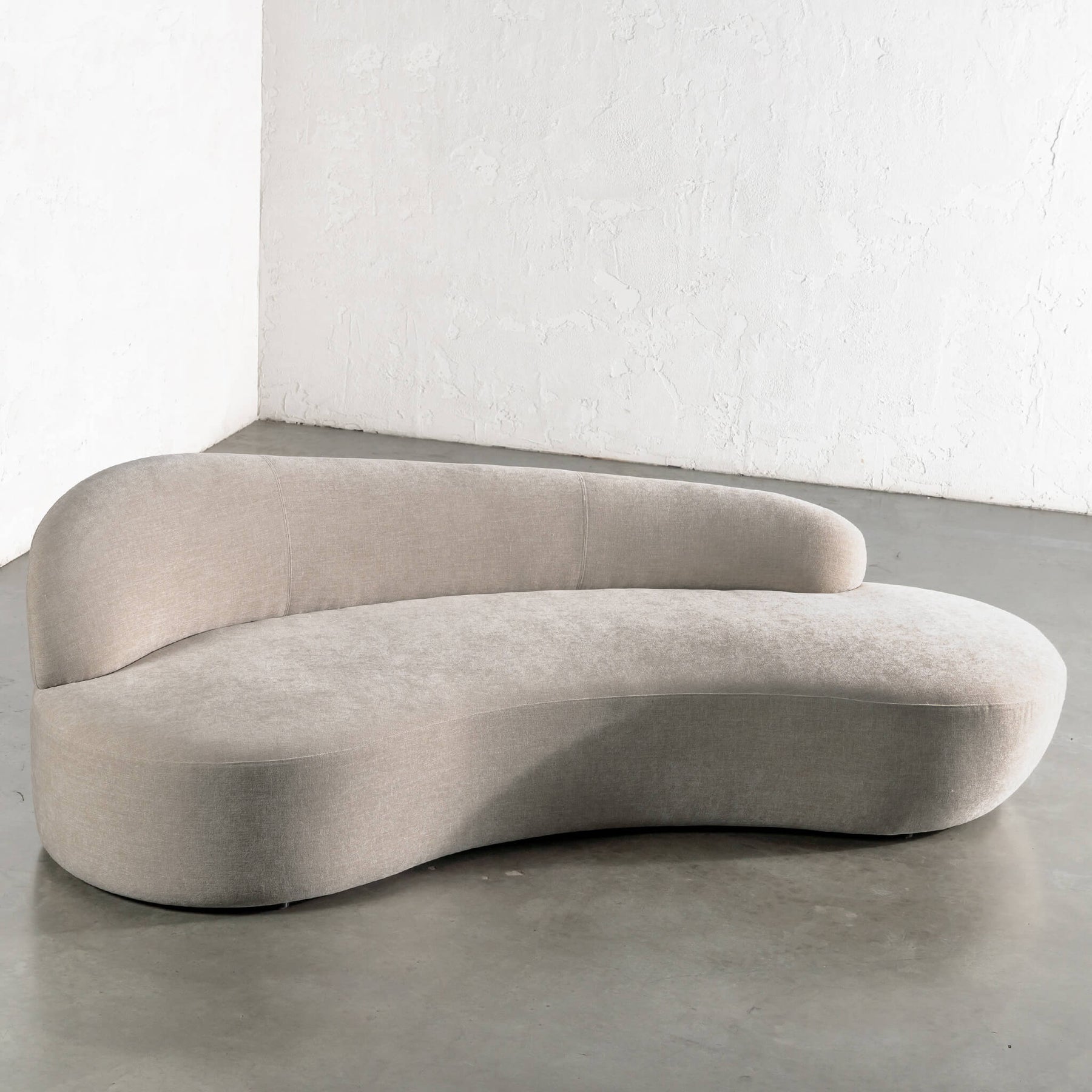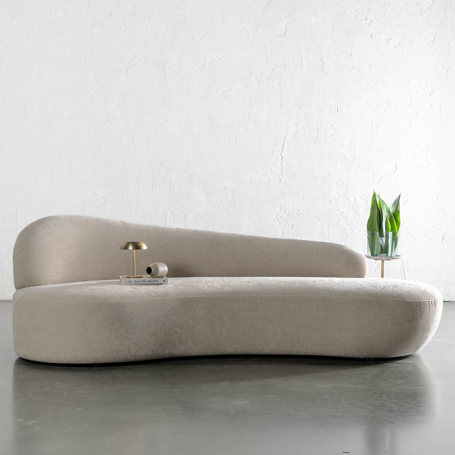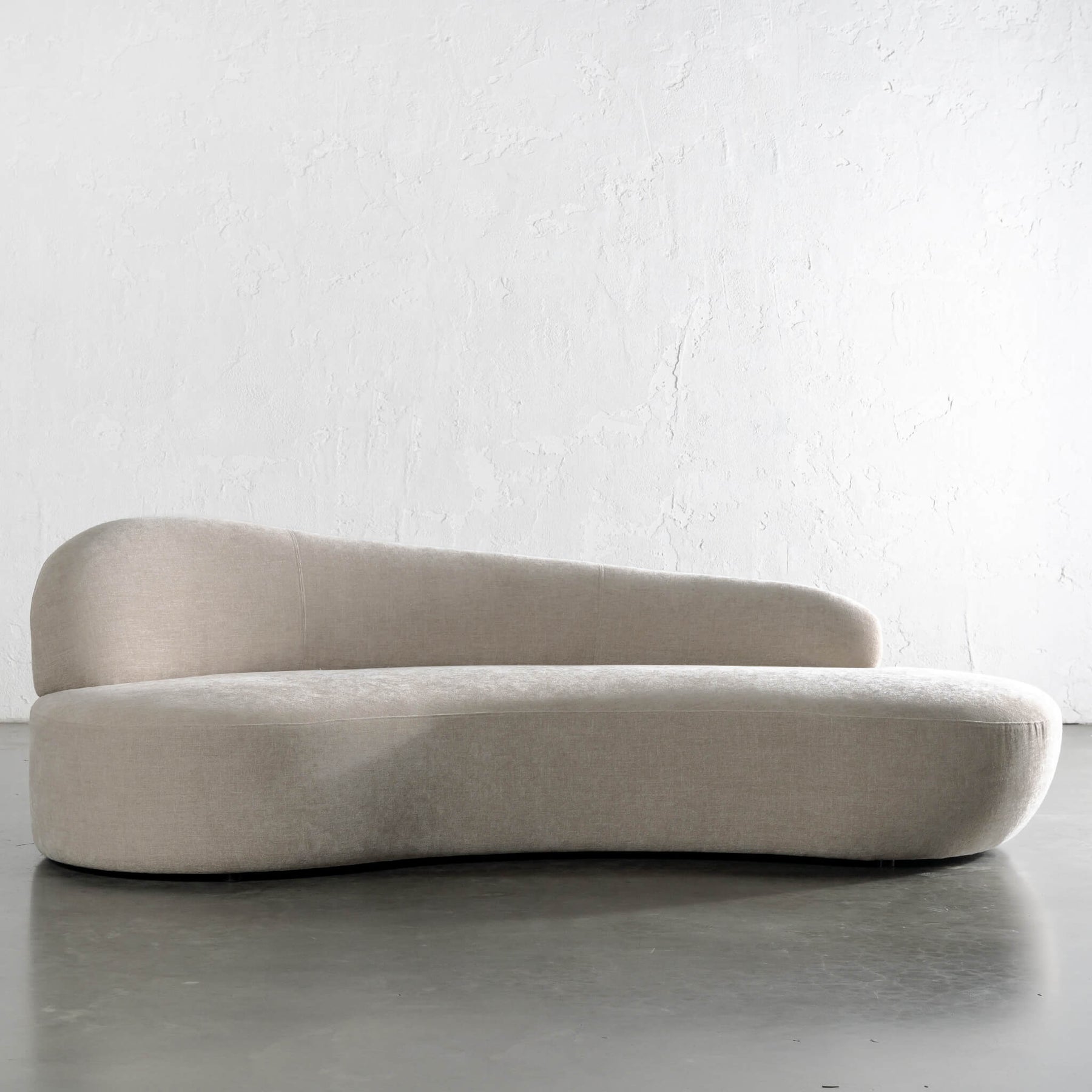 Sculptural and effortlessly inviting, the Loutro Day Sofa is defined by its low, elongated form and softly contoured lines. A gently sloping backrest introduces an element of asymmetry, creating visual interest while offering relaxed support for lounging or reclining. Upholstered in a tactile fabric, the Loutro exudes a quiet, natural elegance that complements its organic silhouette. The generous proportions and deep seat encourage moments of pause, whether styled as a statement piece or layered within a considered living space.