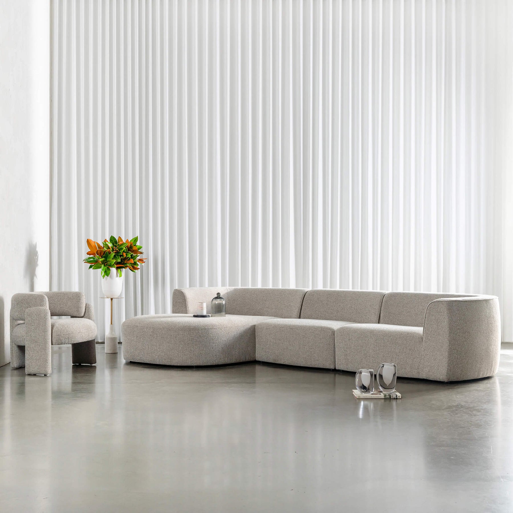 The Faro designer range is uniquely crafted with the right balance between comfort and style. The textured luxe fabrics + strong attention to detail paired with a coordinated blend of craftsmanship, ensures this range will be a classic for years to come. The curvaceous design creates a gentile atmosphere, ideal for modern-day living, perfect for relaxing. The Faro Armchair is a minimalist rounded design with clean lines, whilst having sumptuous surround cushions. The Faro armchair + Faro Modular Lounge Chaise Sofa would look ideal in classic modern apartments, rural country homes, or airy beach homes alike. An ideal armchair as a feature piece in larger shared space, or likewise in for a bedroom corner or nook, with it being both stylish yet practical.