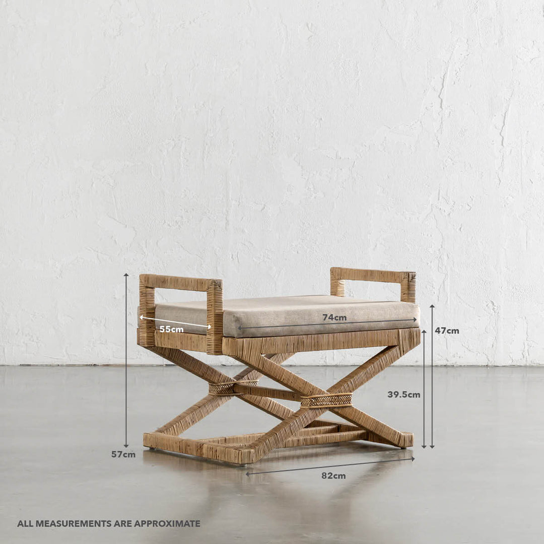 SAN AUGUSTINE RATTAN HERRING WEAVE  |  CROSS LEG STOOL WITH PADDED SEAT  |  NATURAL RATTAN | MEASUREMENTS
