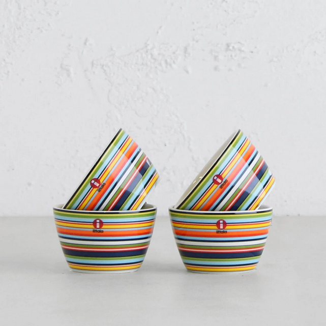 The vibrant striped patterns of the Iittala Origo collection offer a lively and colourful accent to any setting, adding a dynamic flair to your decor. With their defined structure and rhythmic design, these snack bowls illuminate any occasion, turning even the simplest gatherings into memorable events.