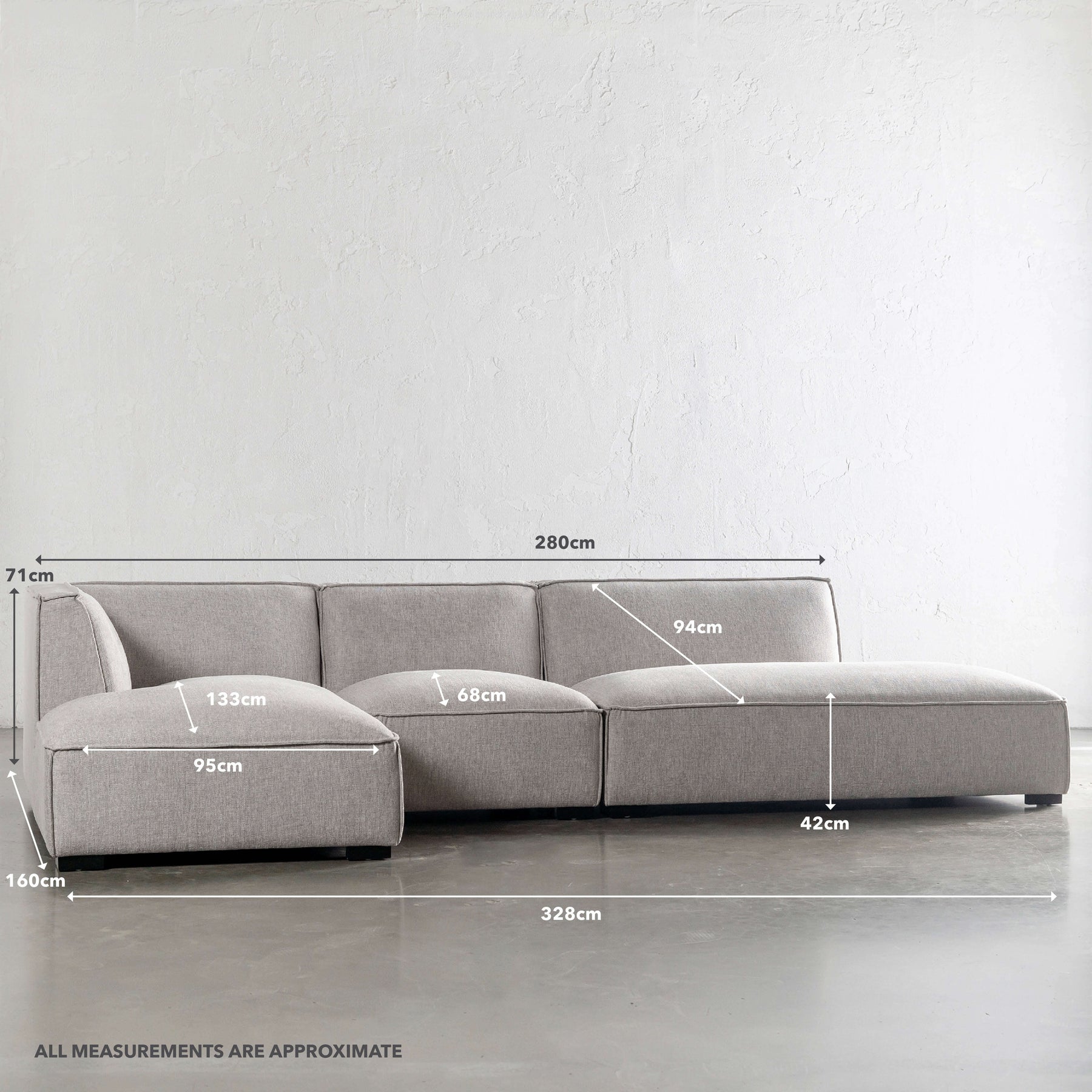 Approximate dimensions of the Provato Modular Chaise Sofa are: