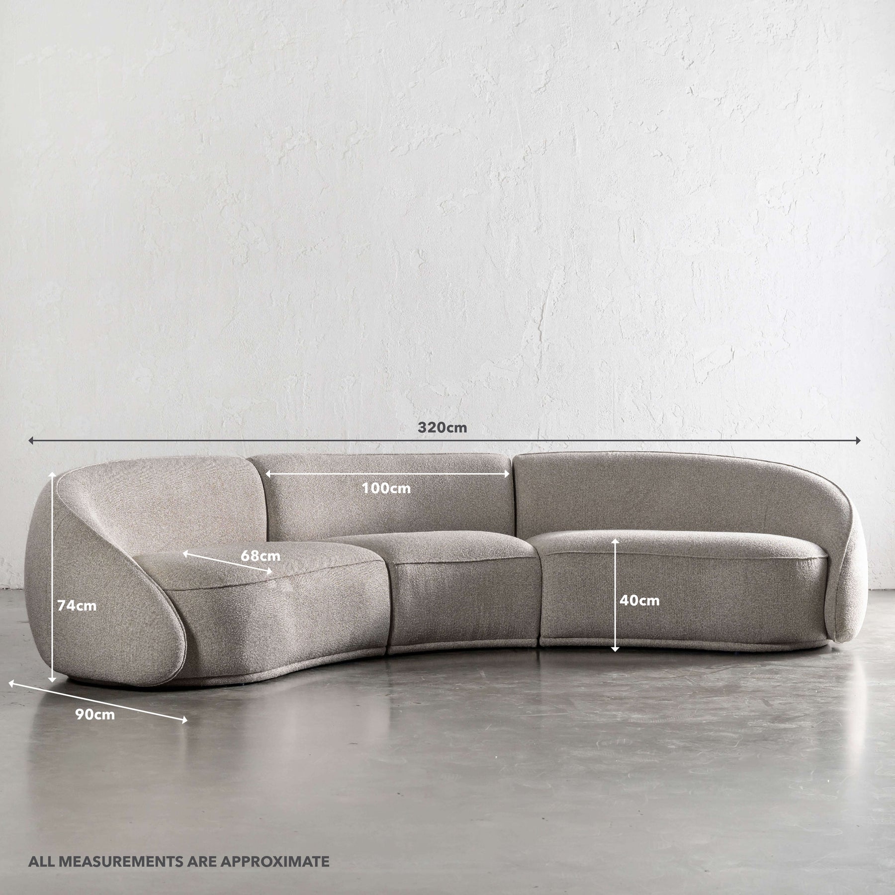 Approximate dimensions of the Lincoln Curved 3 seater Sofa are:
