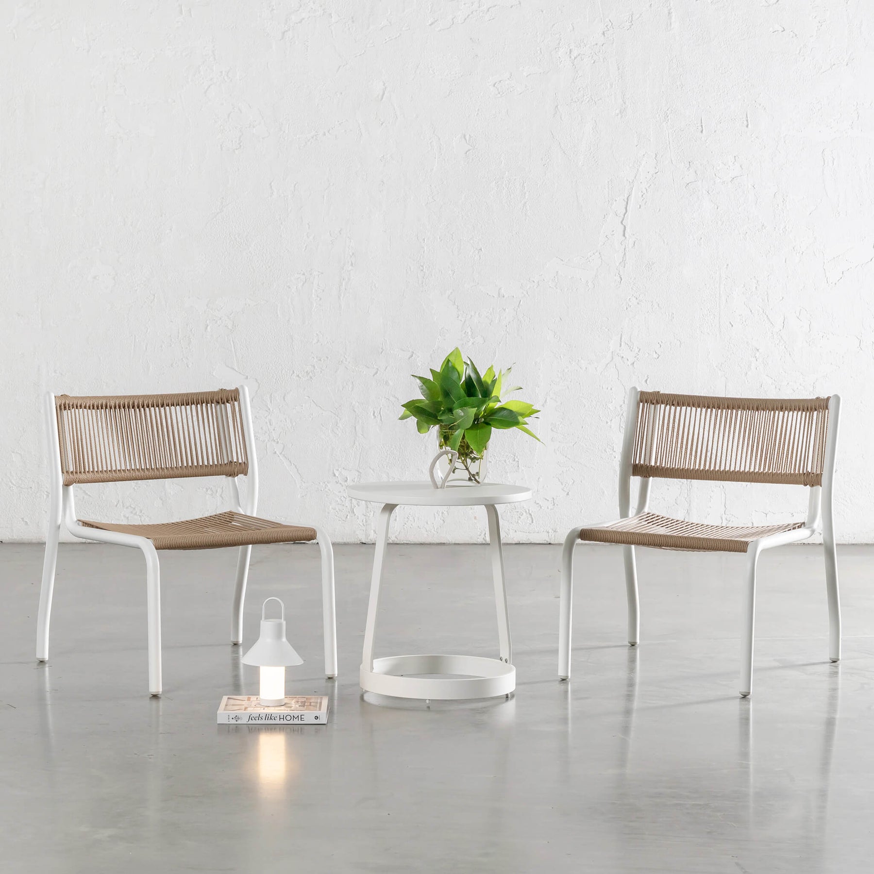 Our exclusively designed Piscina 3 Piece Setting in Milk White with Natural Rope Detail captures the essence of relaxed Mediterranean living, where sculptural form meets effortless coastal ease. Comprising two dining chairs and a complementing round side table, this refined trio draws inspiration from sun-washed terraces + clean architectural lines. The crisp Milk White frame contrasts beautifully with the warmth of natural woven rope, delivering a light, airy aesthetic that feels both contemporary + enduring.