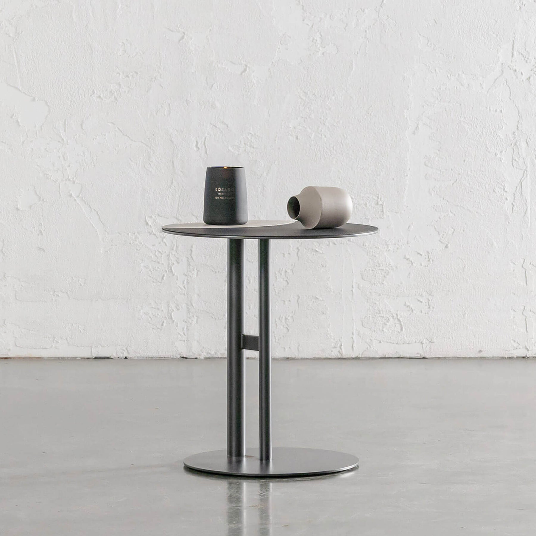 PANZANO TWO TONED ROUND SIDE TABLE | IVORY LATTE + BLACK LEATHER