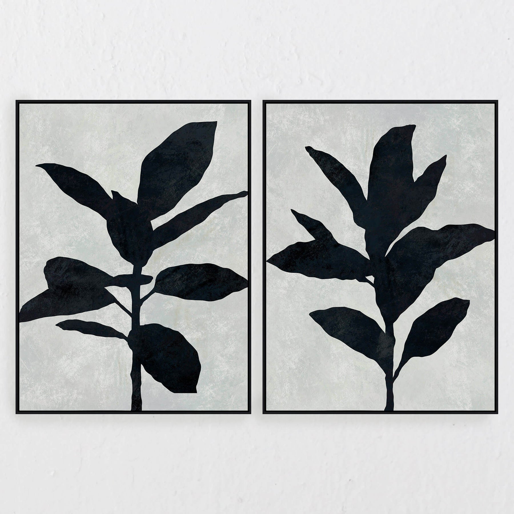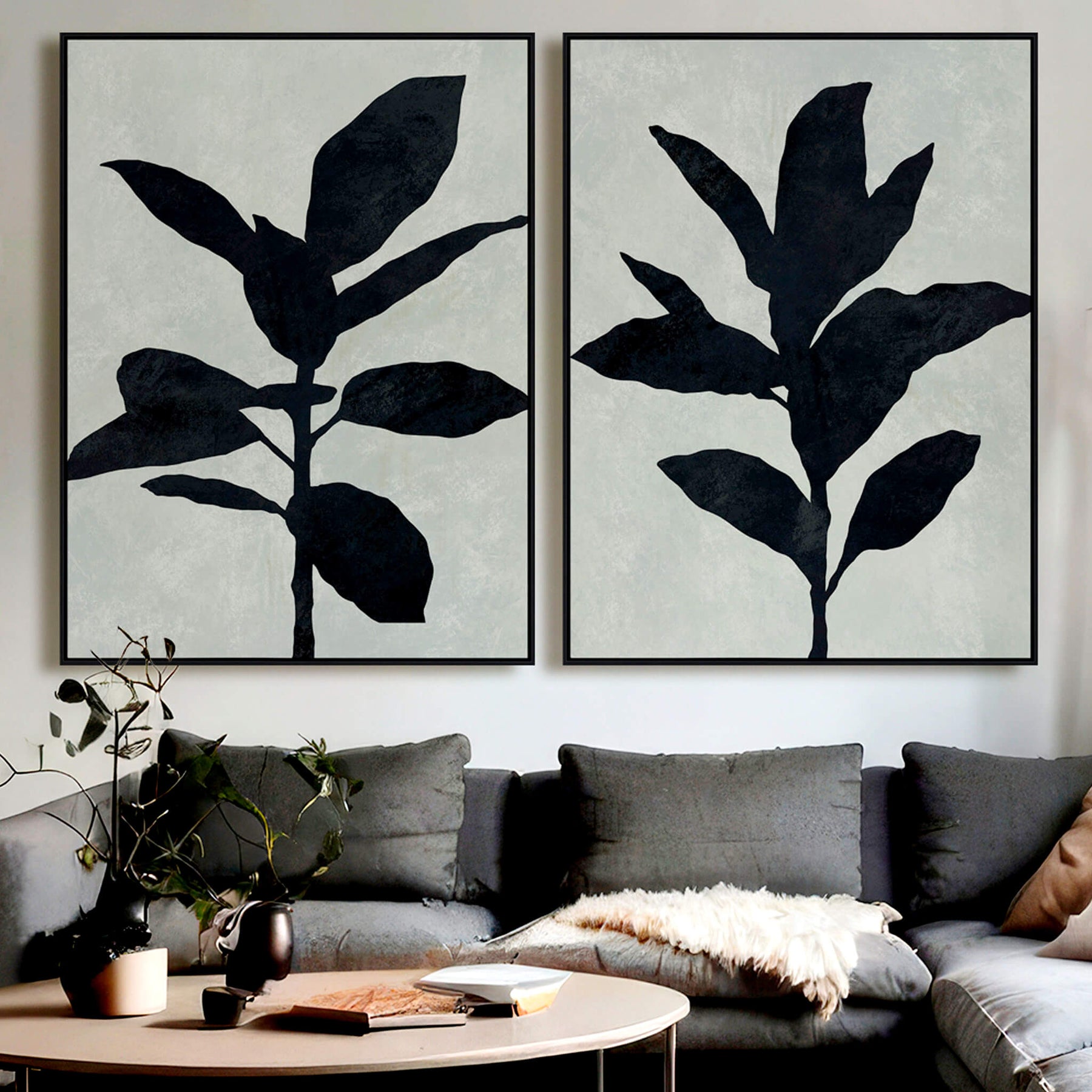 Bring modern elegance to your walls with the LBD Exclusive Pavia framed canvas print set, framed in a lightweight composite Black frame, featuring two 100cm x 140cm pieces. This contemporary set of two framed prints introduces a striking interplay of contrast and form, where bold botanical silhouettes stand out against a textured, misty neutral backdrop. Deep charcoal leaves are rendered in simplified, abstract shapes, while textural painted brushwork and rough edges add depth and intrigue. With their natural palette and minimal lines, these artworks balance drama with restraint, offering a sophisticated focal point that complements a wide range of interiors. Perfect for bringing an elevated yet grounded presence to your living or dining space, this duo embodies both artistry and timeless design.
