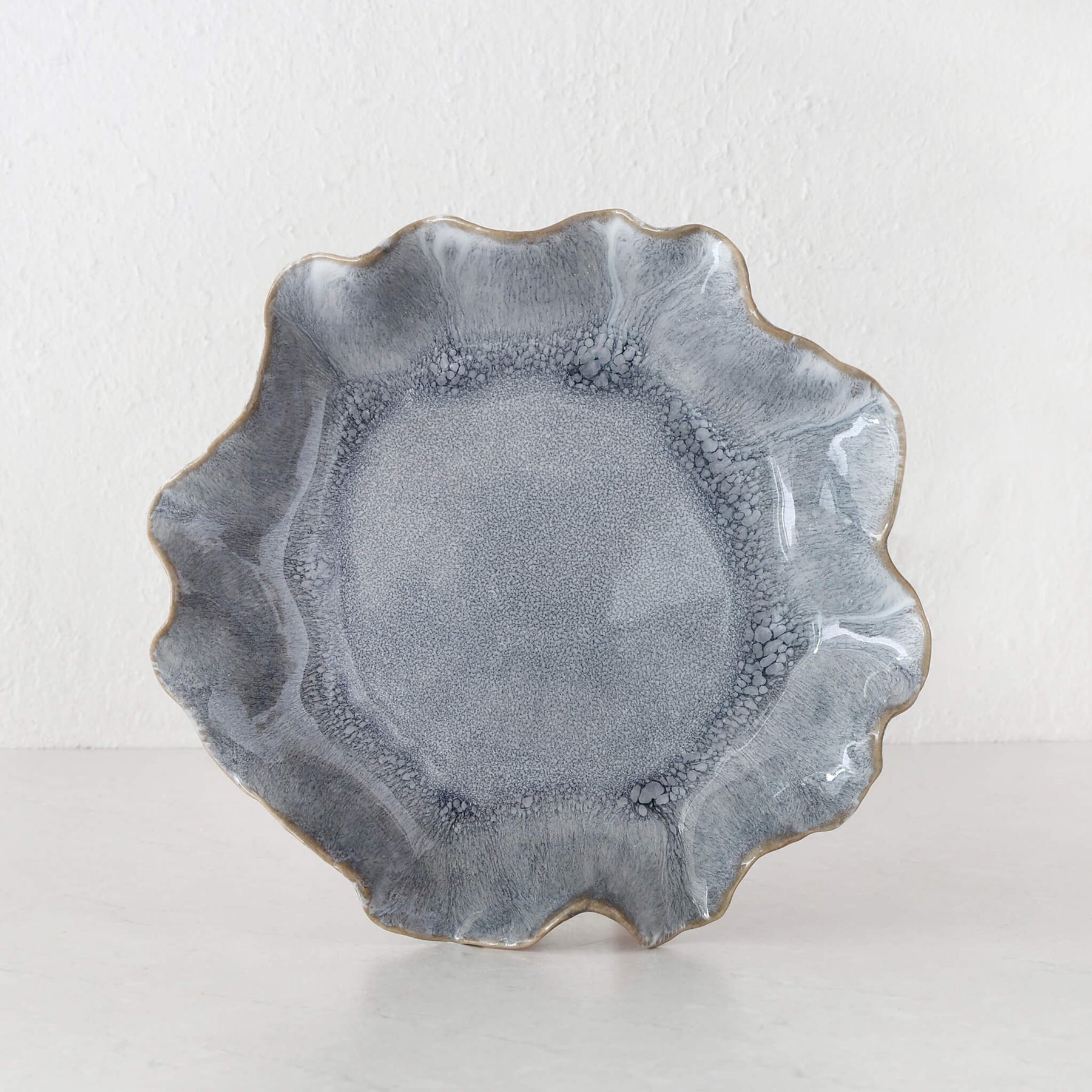 The Costera Bowl in Storm Blue is a striking fusion of organic form and artisanal glaze. Featuring a softly scalloped silhouette, the ceramic bowl is finished in a richly layered reactive glaze that moves through tonal blue-grey hues, creating a depth reminiscent of coastal stone and shifting tides. Subtle variations and textured pooling within the glaze ensure each piece carries its own unique character.