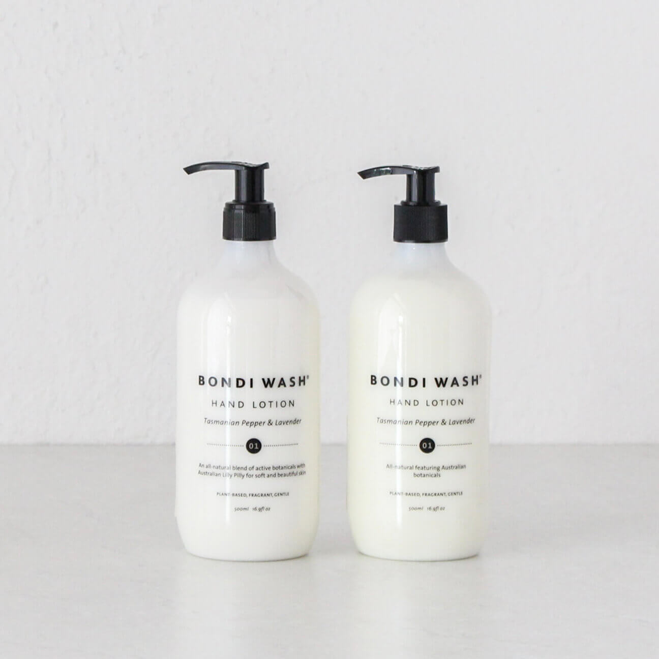This bundle includes 2 x 500ml bottles of Bondi Wash body lotion - Tasmanian Pepper + Lavender...
