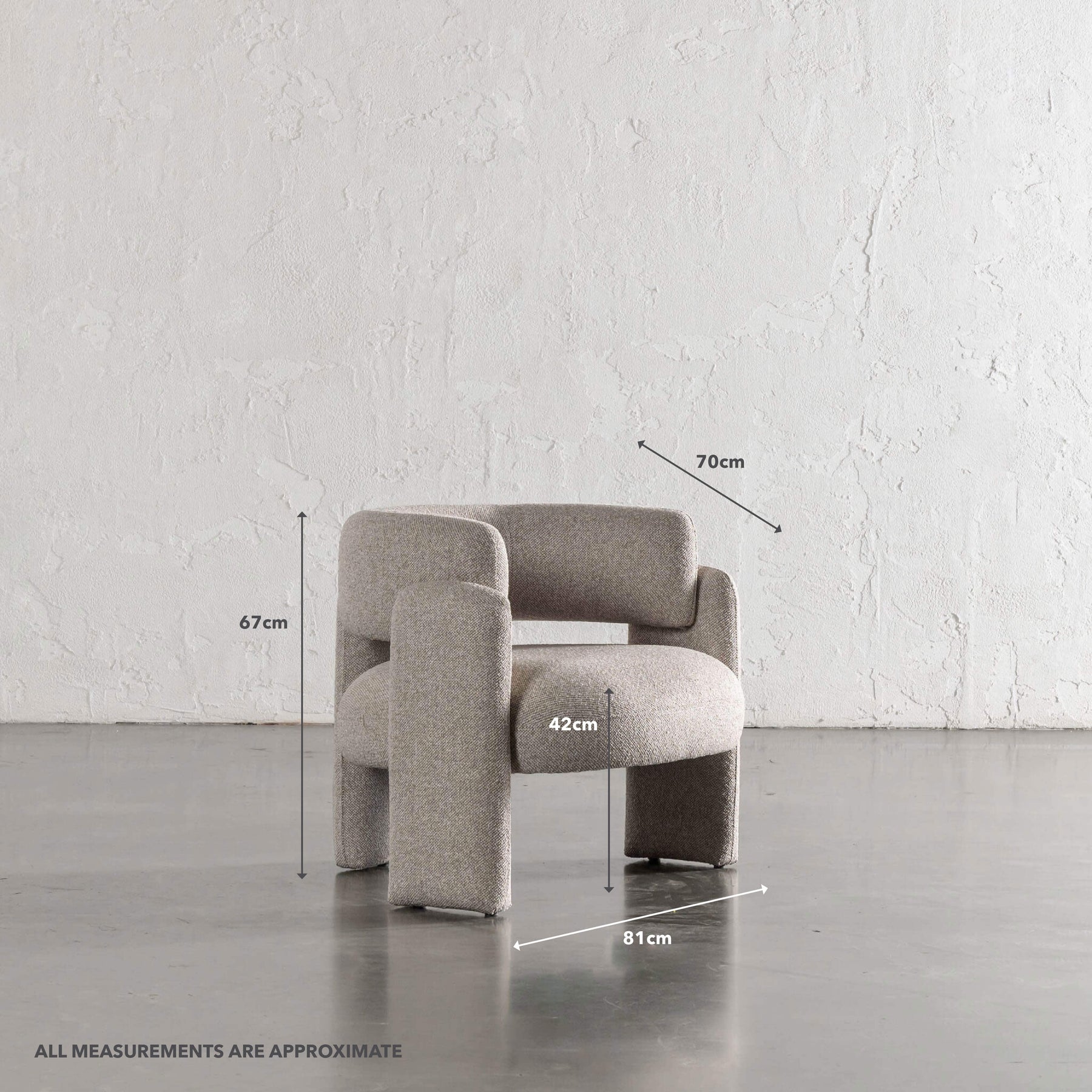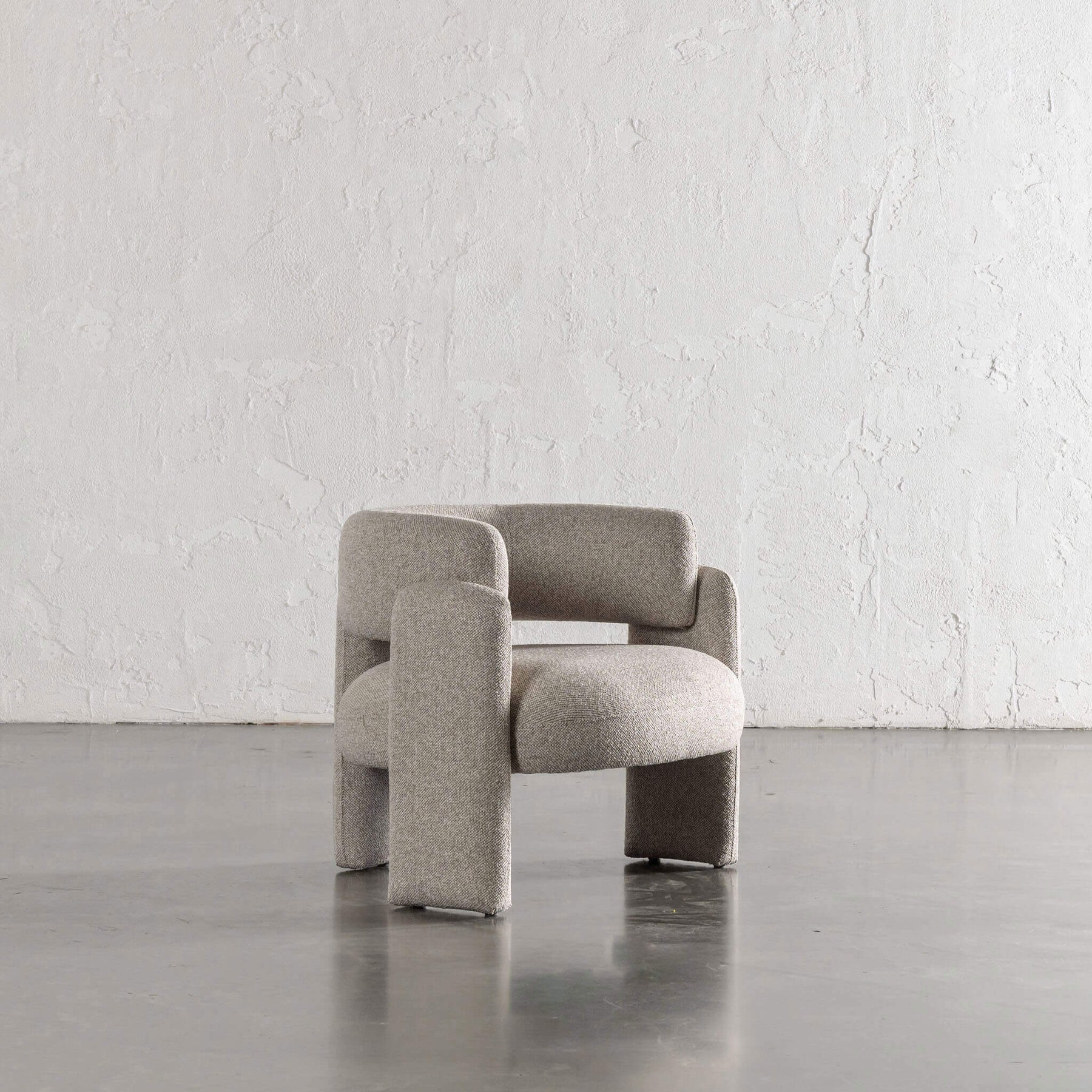 The Faro armchair collection is crafted with an upholstered hardwood frame, showcasing a distinctive tri-leg design that combines bold aesthetics with structural integrity, the sumptuously padded seat with polydown [foam/down/feather], offering superior comfort + structure. The tightly woven textured weave cotton + polyester blended fabric ensures durability. Available in our luxe hand-selected textured Granite Haze + Sandy Dusk + Windswept Beach + Banksia Leaf Green + Snow Cap White + Pebble Bay Mist fabric. This range is made to last and supported with a fabric and structural warranty.