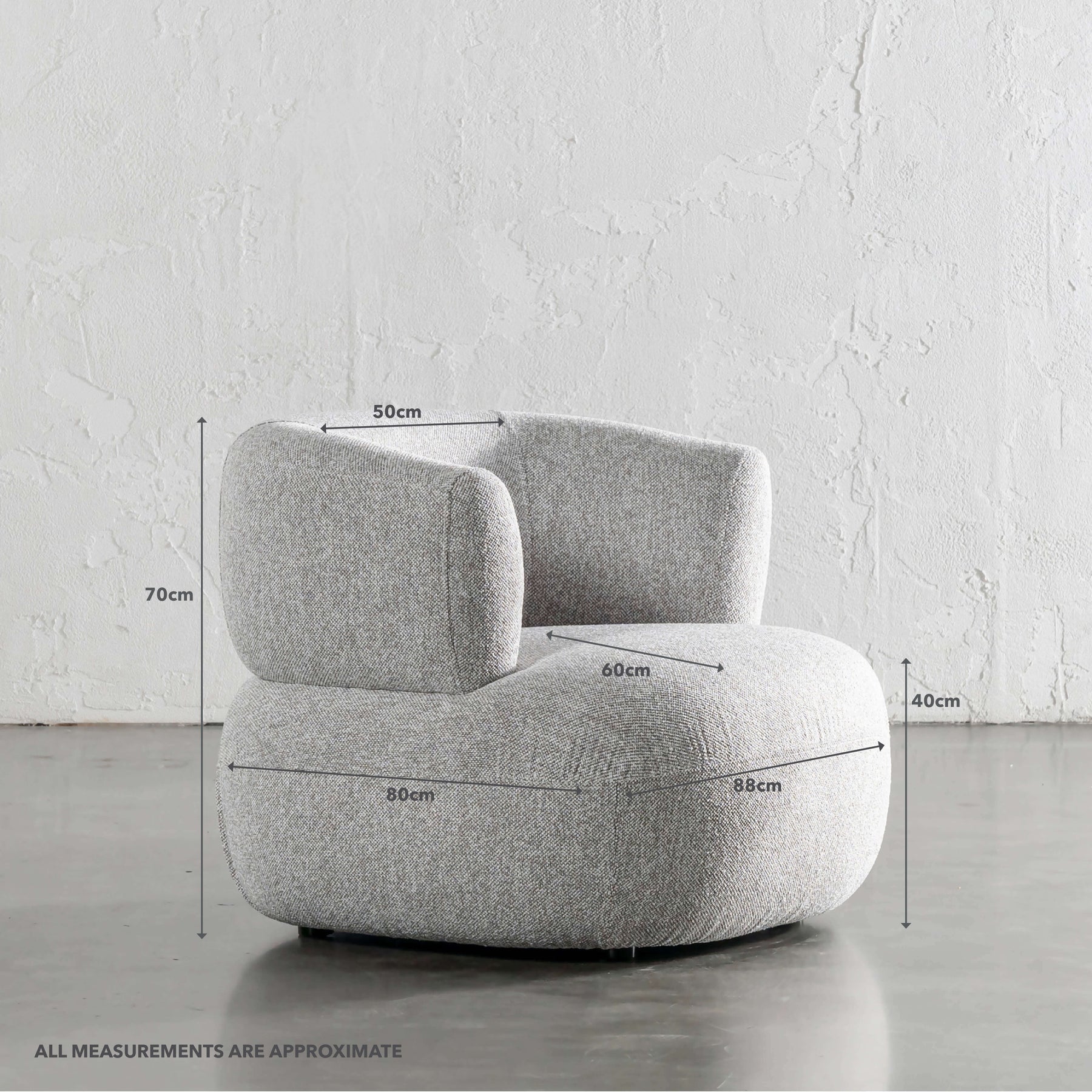 The Carson designer range is uniquely crafted with the right balance between comfort and style. The textured luxe fabrics + strong attention to detail paired with a coordinated blend of craftsmanship, ensures this range will be a classic for years to come. The curvaceous design creates a gentile atmosphere, ideal for modern-day living, perfect for relaxing. The Carson Rounded Armchair is a minimalist rounded design with clean lines, whilst having sumptuous surround cushions. The Carson Rounded Armchair would look ideal in classic modern apartments, rural country homes, or airy beach homes alike. An ideal armchair as a feature piece in larger shared space, or likewise in for a bedroom corner or nook, with it being both stylish yet practical.