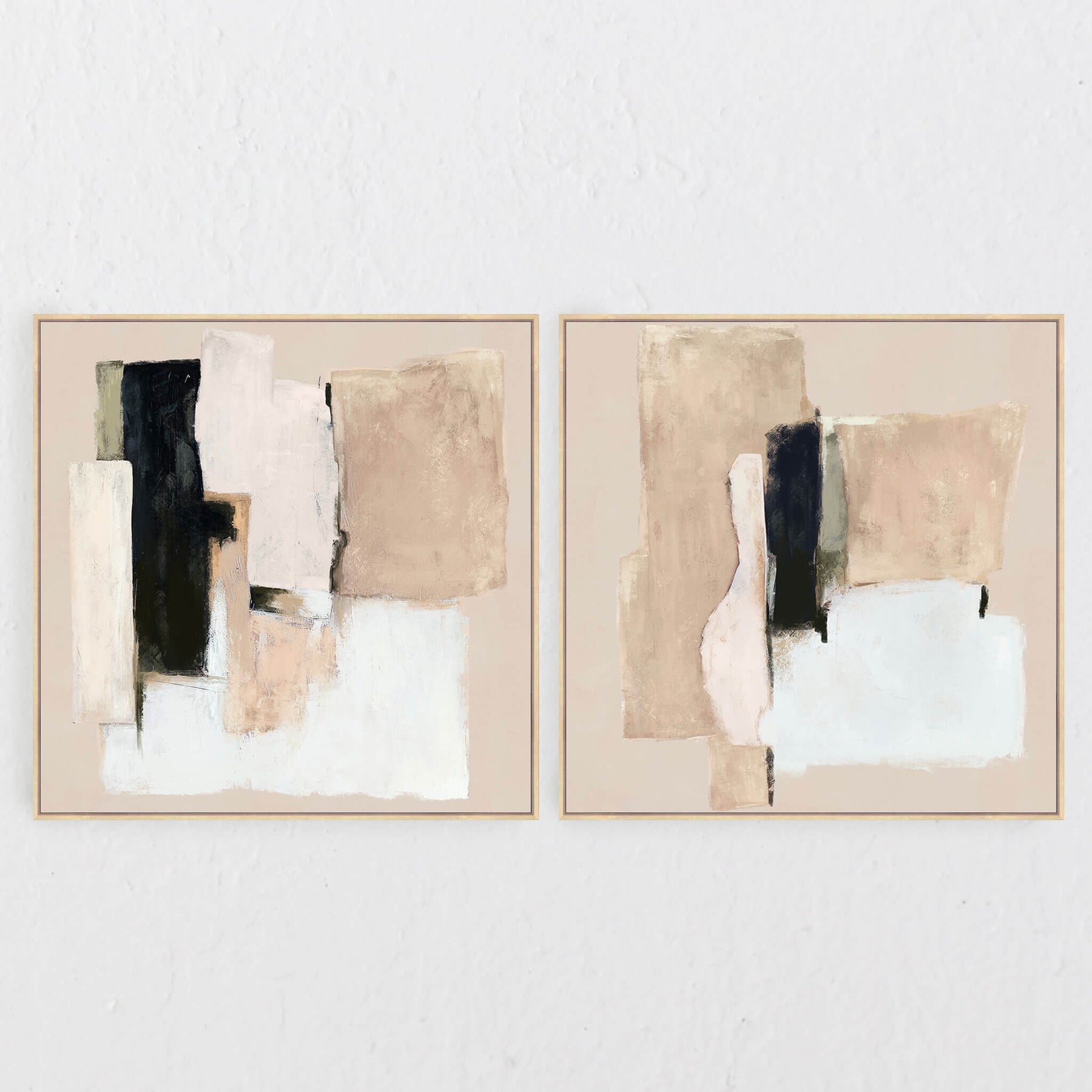 Bring earthy elegance to your walls with the LBD Exclusive Bassano framed canvas print set, framed in a lightweight composite Natural Bamboo frame, featuring two 100x100cm pieces. This set of two textured prints on hessian features abstract compositions in a calming, neutral palette. Each piece showcases a layered arrangement of organic shapes and textured brushstrokes in shades of beige, blush, white, soft taupe, and deep black. The irregular forms and gentle contrasts create a harmonious, balanced aesthetic. The use of hessian as the canvas adds a tactile, natural element, enhancing the earthy, organic feel of the artwork. Perfect for modern or coastal-inspired interiors, these prints offer a subtle yet sophisticated visual impact when styled as a pair.