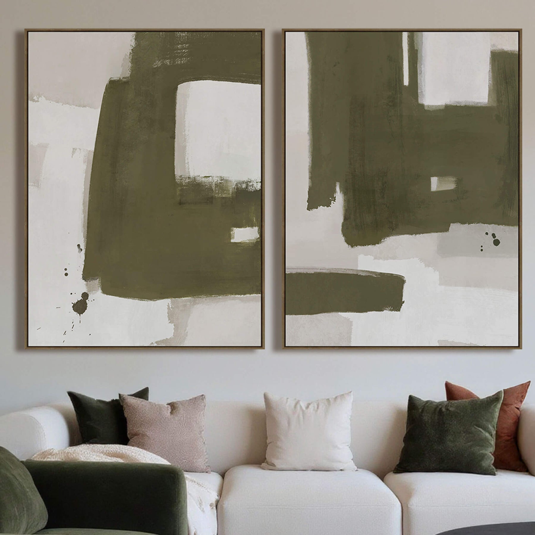Bring earthy elegance to your walls with the LBD Exclusive Olten framed canvas print set, framed in a lightweight composite Oak Natural frame, featuring two 90x120cm pieces. This canvas print set features two abstract compositions with bold, geometric shapes in earthy olive tones contrasted against soft whites and light beige backgrounds. The hand embellishment details create a modern, earthy vibe by blending bold colour blocks with a natural, textured look. These prints would complement contemporary, rustic, or bohemian interiors, bringing warmth and a sense of grounded simplicity to the space.