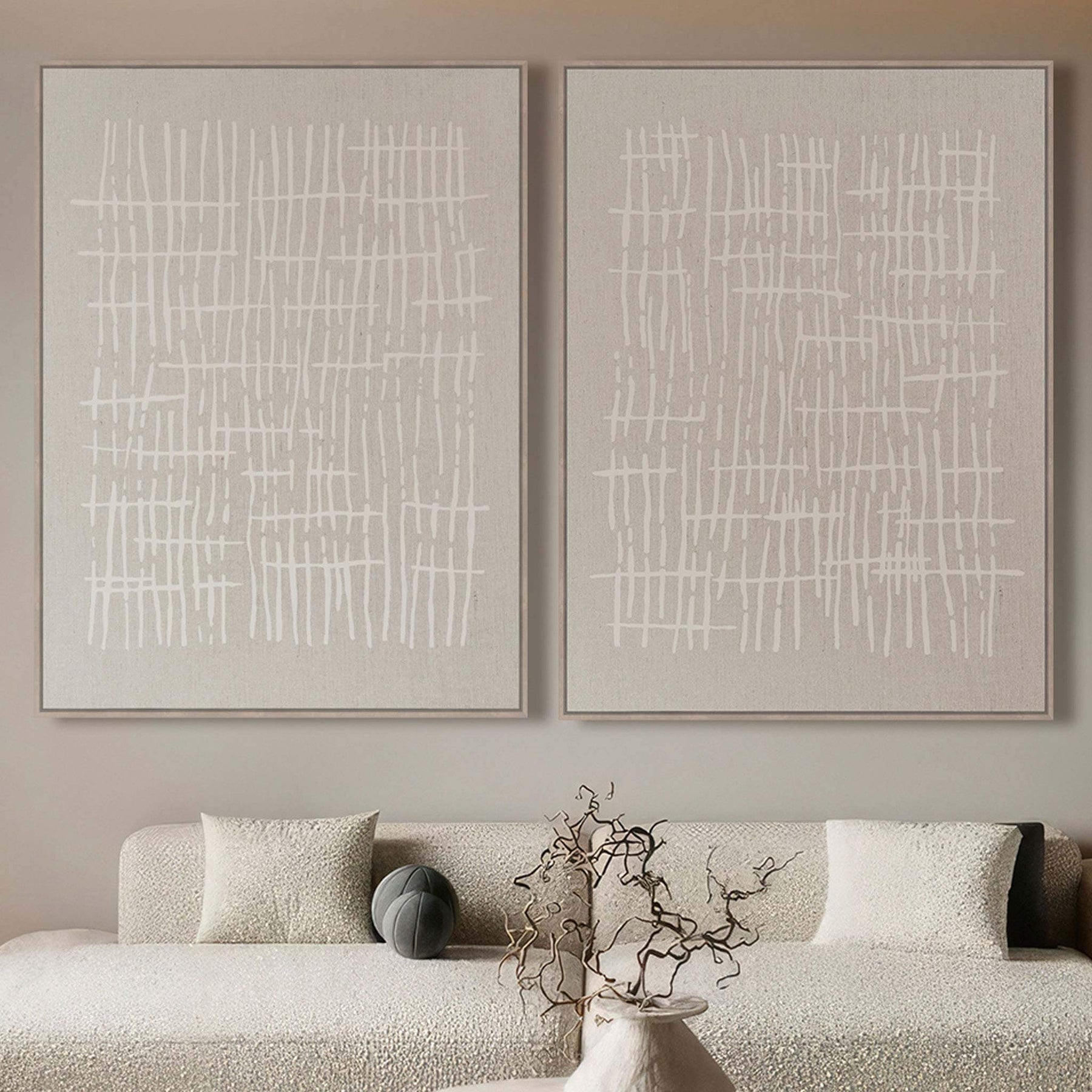 Bring neutral elegance to your walls with the LBD Exclusive Sondrio framed canvas print set, framed in a lightweight composite Light Natural frame, featuring two 90x120cm pieces in earthy off-white natural tones. This linen print set features two abstract artworks with a subtle, neutral palette. Each piece displays a series of overlapping white brushstrokes arranged vertically and horizontally, forming an irregular, woven-like pattern. Set against a soft beige, linen-textured background, the prints offer a light, airy feel with understated texture and depth. Their minimalist design and natural tones make them ideal for Scandinavian, coastal, or modern interiors.