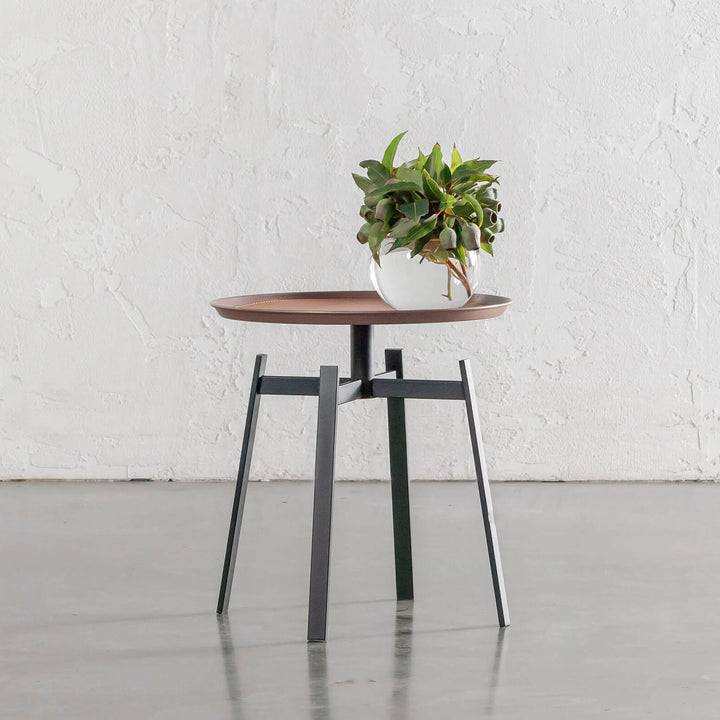 PANZANO ROUND 4 PILLAR SIDE TABLE | HAVANA TAN LEATHER