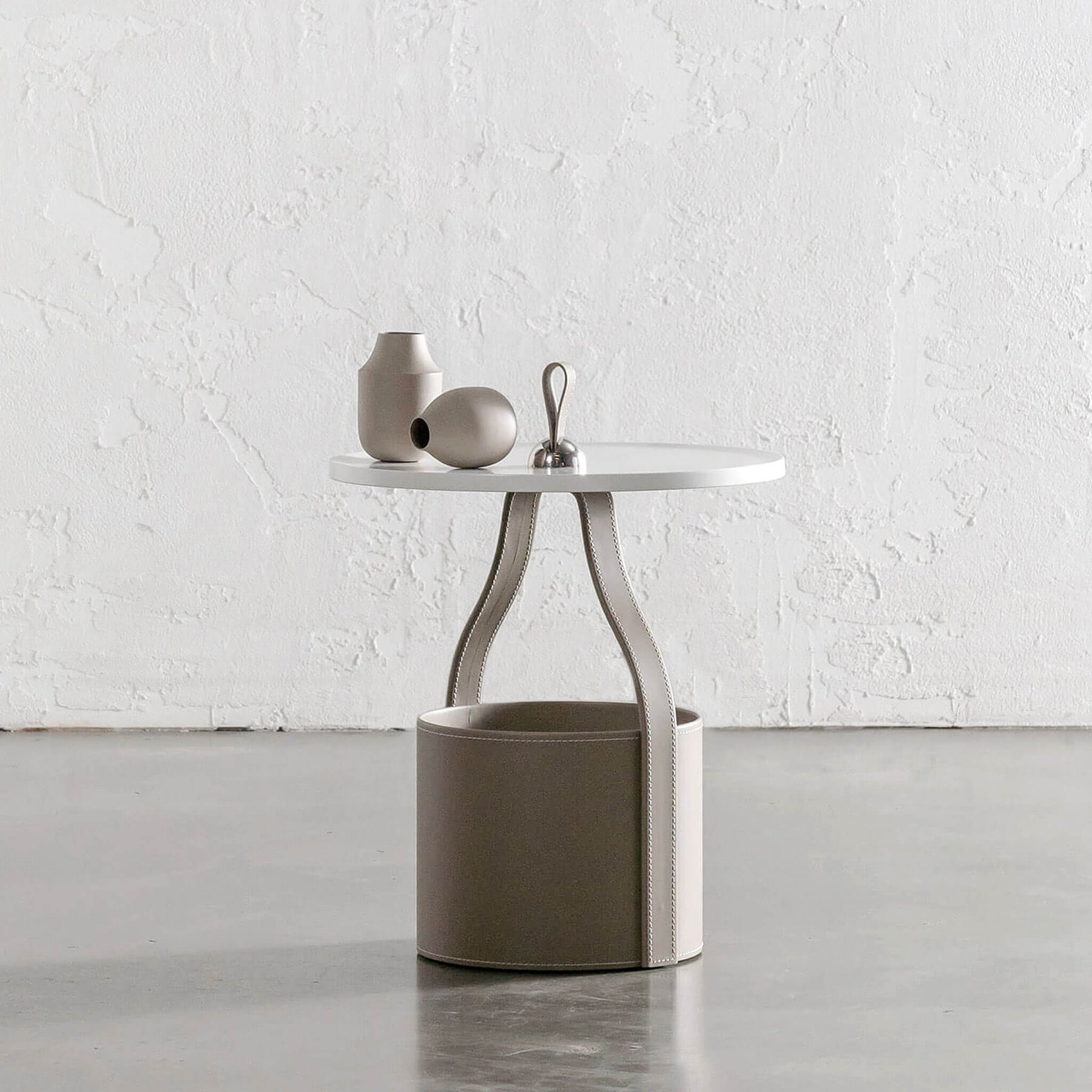 PANZANO TIERED SIDE STORAGE TABLE | KHAKI STONE LEATHER