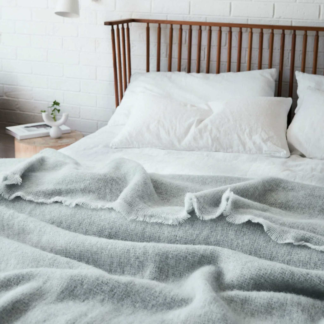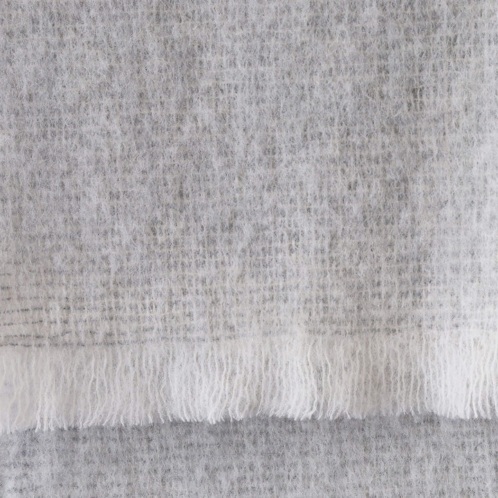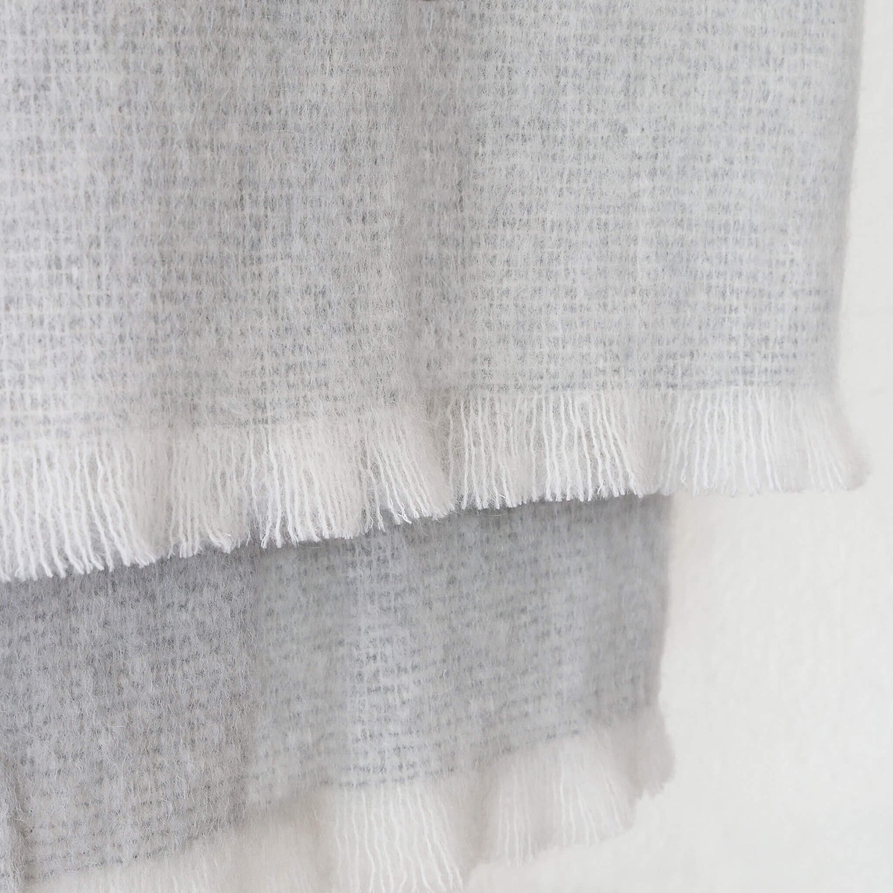 The Heather St Albans Alpaca blanket throw in a delicate, silver/grey throw has a subtle textured design over a natural shade.